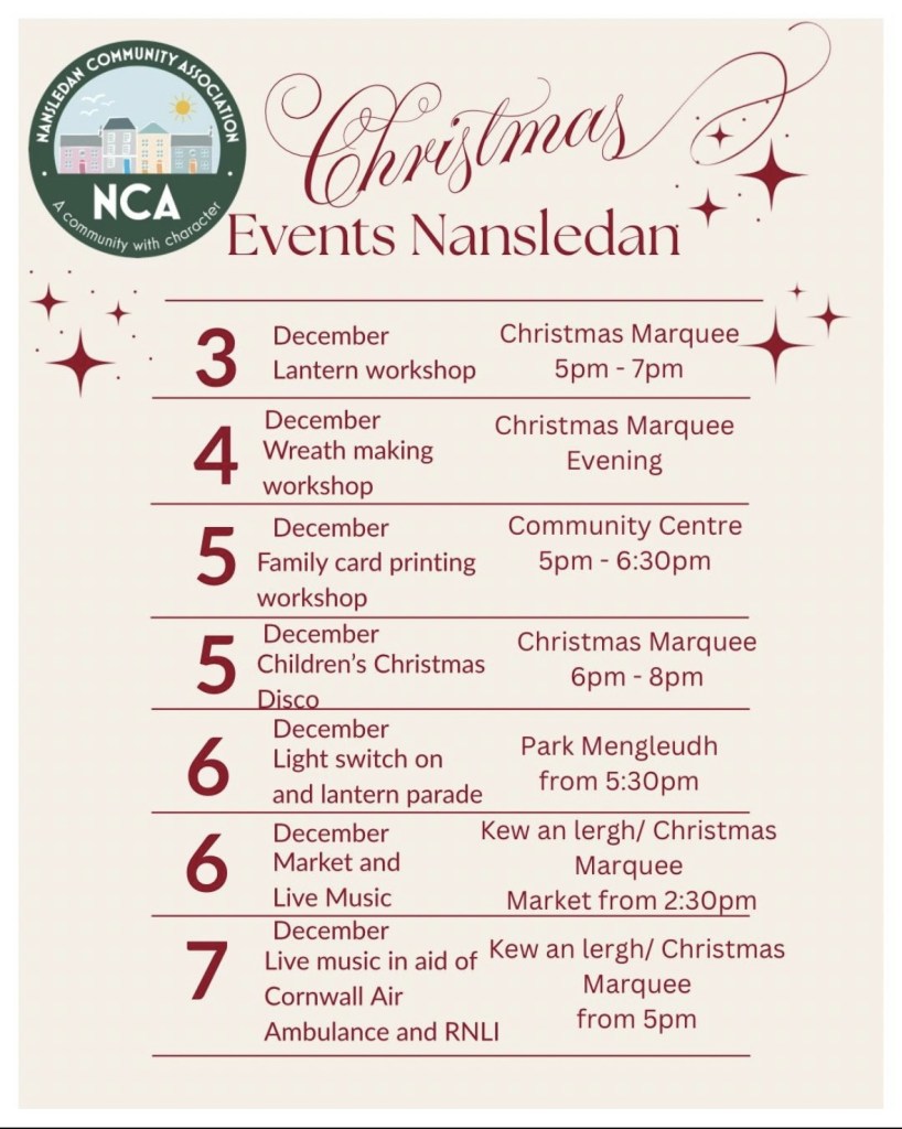 A Summary of what to expect this week, on the run up to the Nansledan Light switch on with activities for all the family. Late night shoping across Nansledan for those special Christmas gifts. Or just relax and have a glass of mulled wine or some nibbles in the local eateries. See below notices for full details.